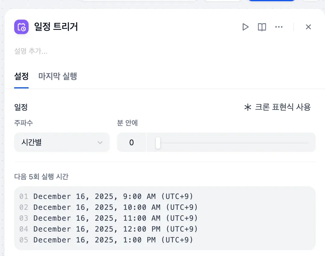복잡한 일정은 “크론 표현식 사용”을 클릭해 설정할 수 있습니다. https://docs.dify.ai/en/use-dify/nodes/trigger/schedule-trigger#examples를 참고하세요.