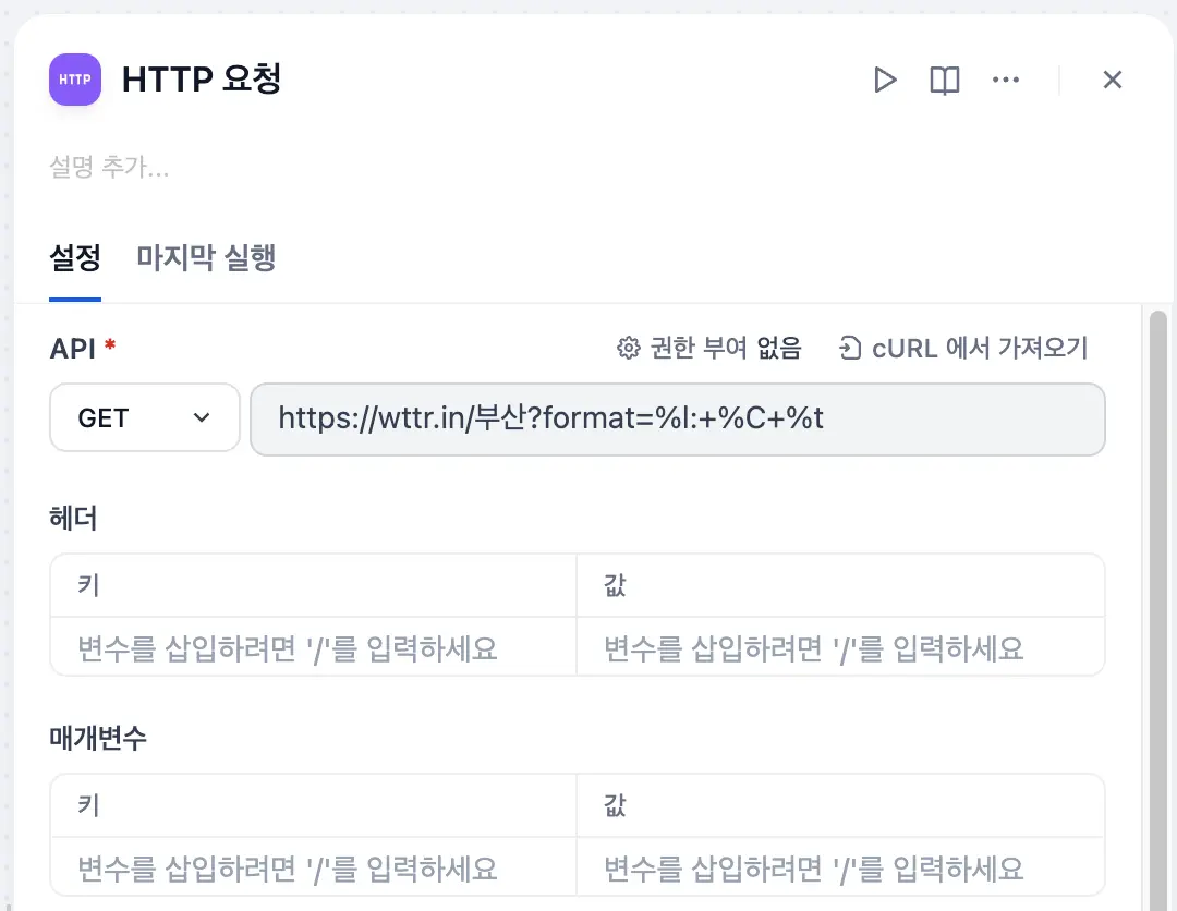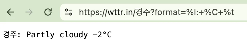 https://wttr.in/부산?format=%l:+%C+%t부산을 원하는 위치로 변경하시면 되고, 변경 시에는 브라우저로 접속해 날씨 정보가 정상적으로 나오는지 확인하세요.
