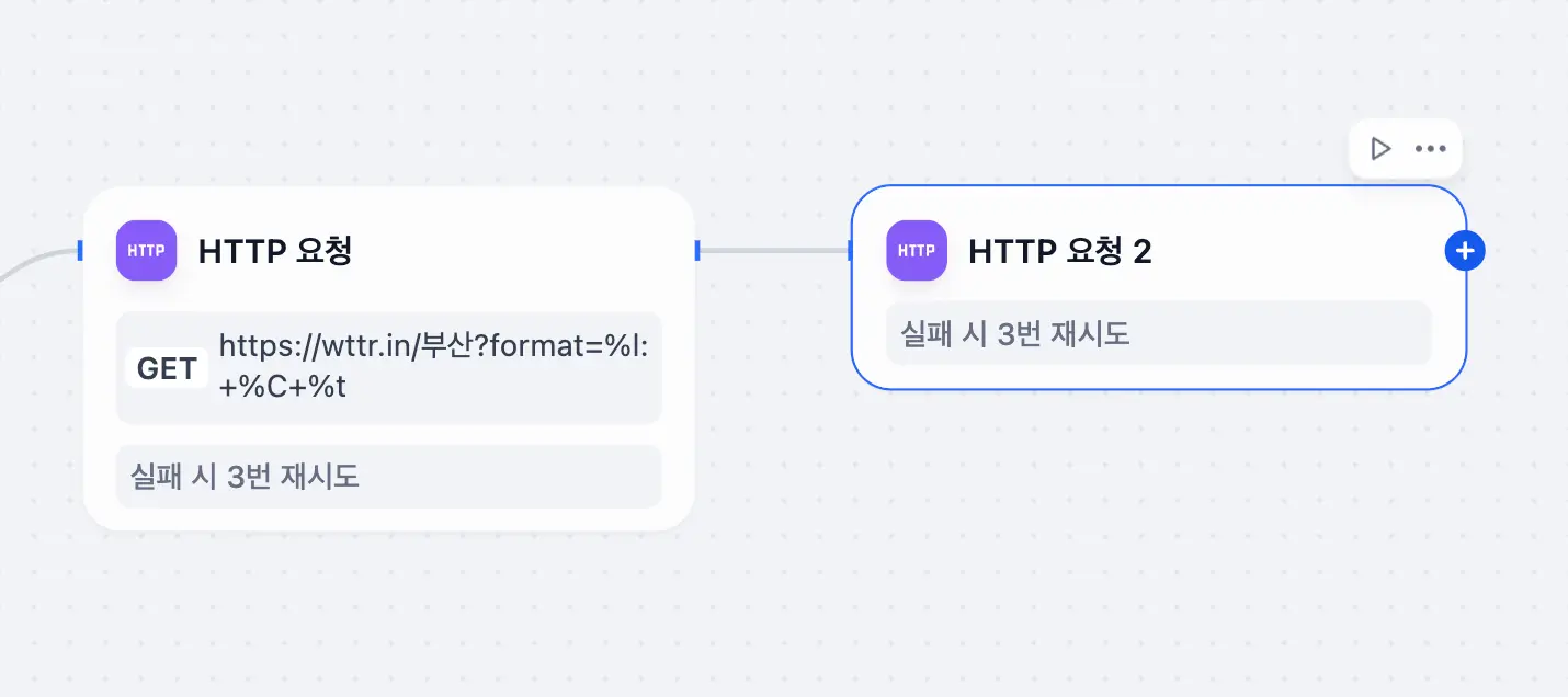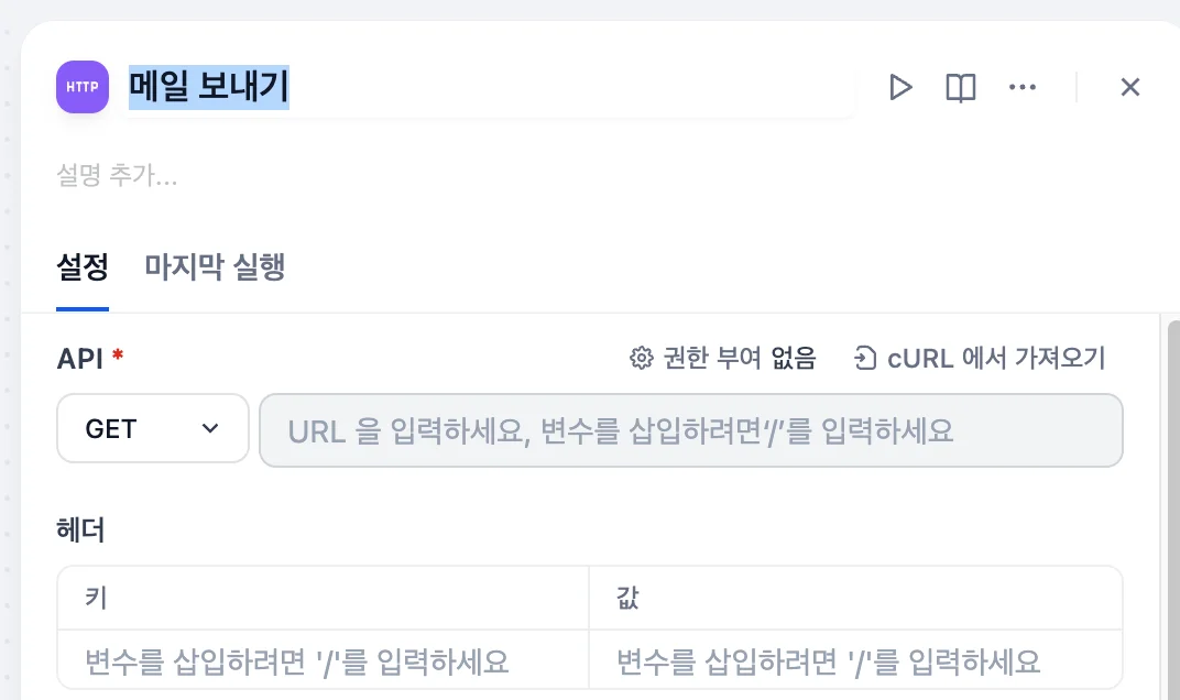 두 번째 HTTP 요청 노드의 이름을 “메일 보내기”로 변경했습니다.