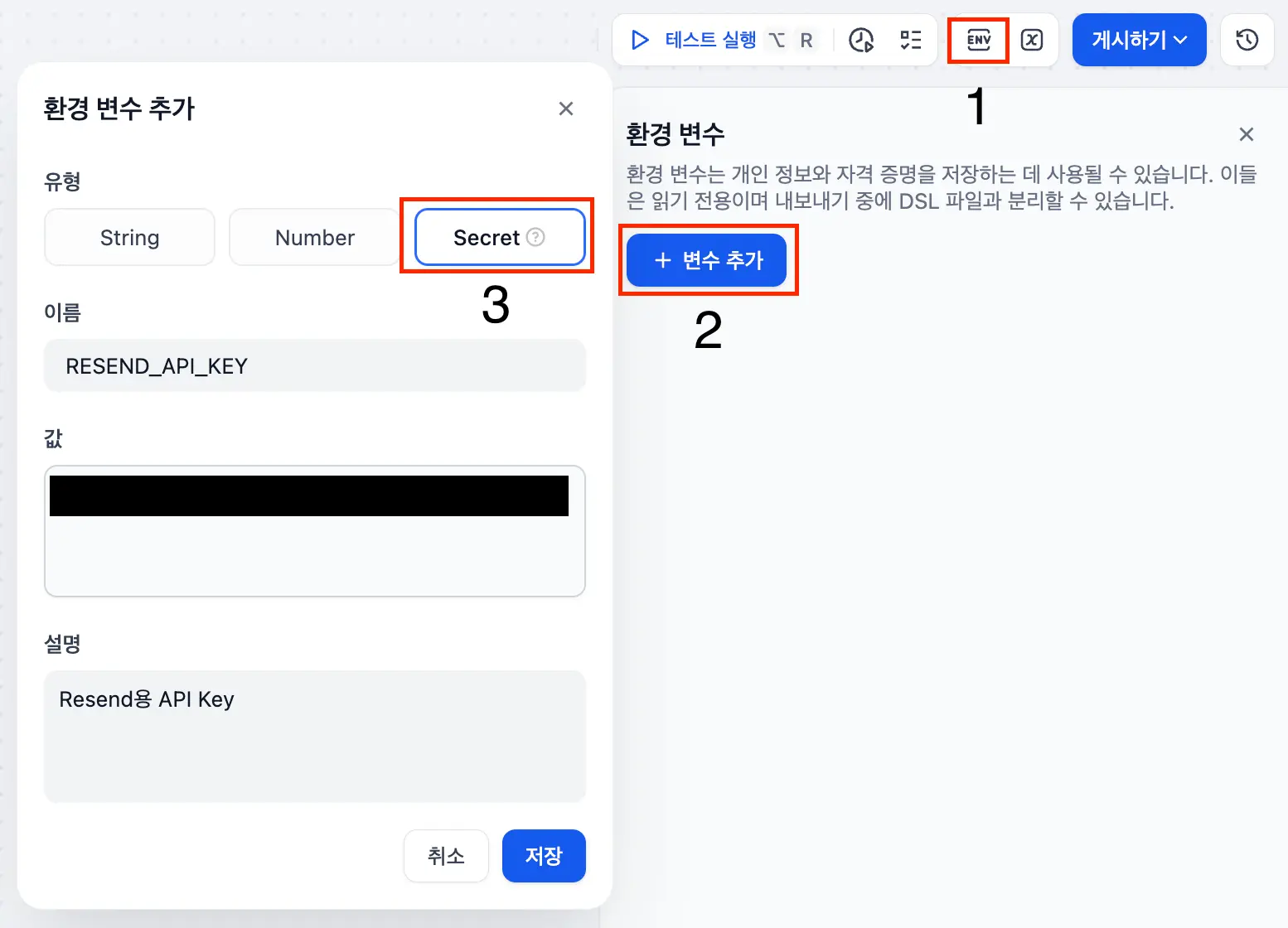 번호 순서대로 클릭해 RESEND_API_KEY를 만들고 저장합니다.