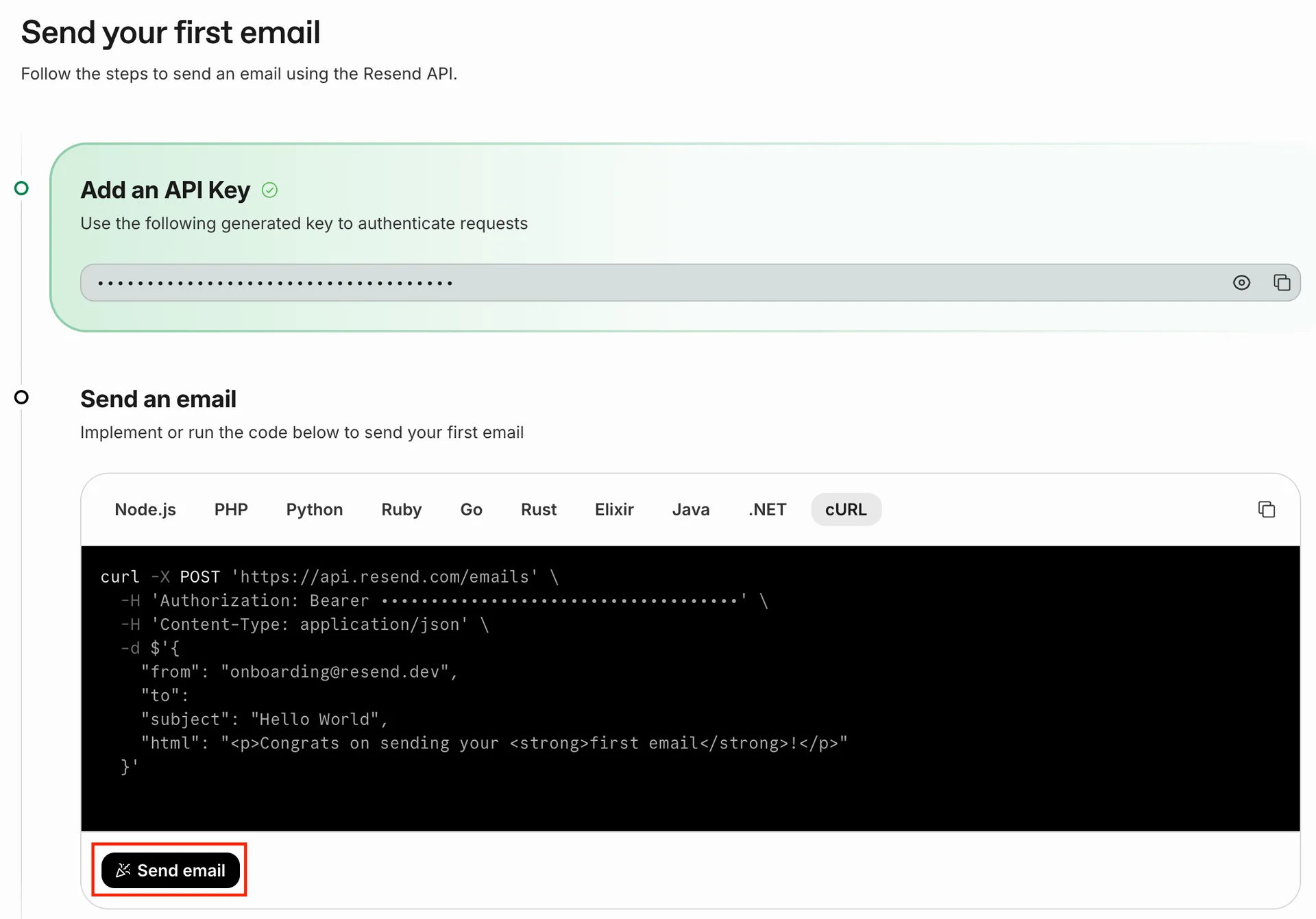 아래의 Send email 버튼을 클릭하면 테스트 메일을 보낼 수 있습니다. 가입한 계정의 메일함에 들어가 보면 Resend에서 보낸 Hello World 메일이 있습니다(보이지 않는 경우 스팸메일함도 확인하세요).