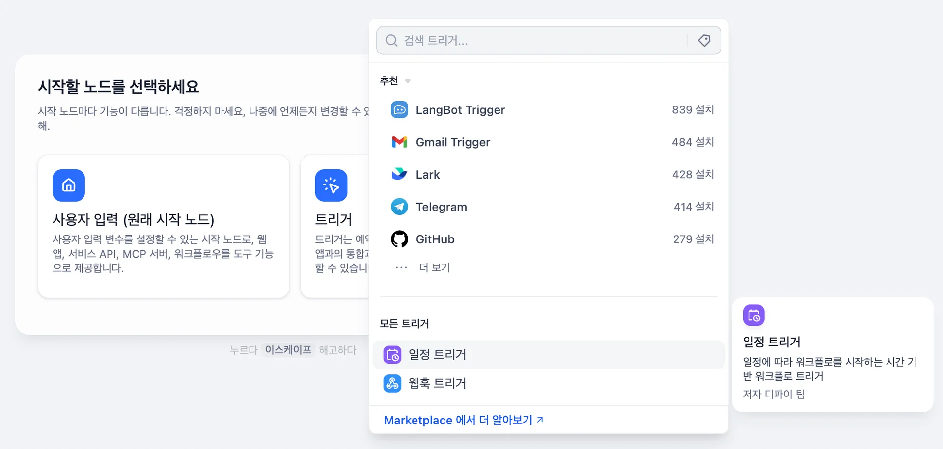 워크플로우를 만들어 줍니다. 자동으로 워프플로우를 실행할 것이므로 시작 노드는 “트리거”의 “일정 트리거”를 선택합니다.