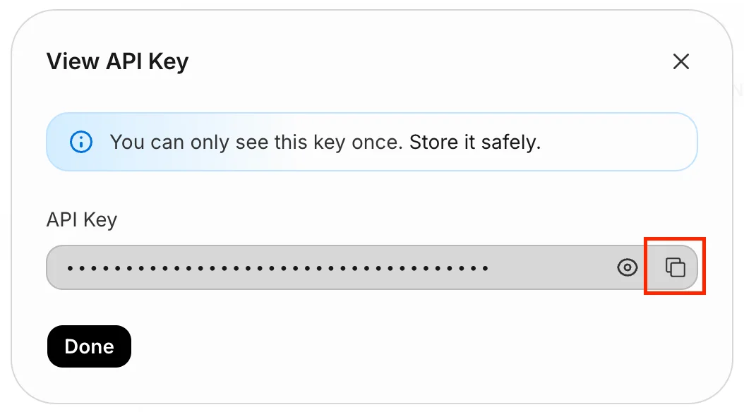 복사 버튼을 눌러 복사합니다. 이 값이 RESEND_API_KEY 값이 됩니다. Done을 클릭하면 다시 복사할 수 없으니 주의하세요.
