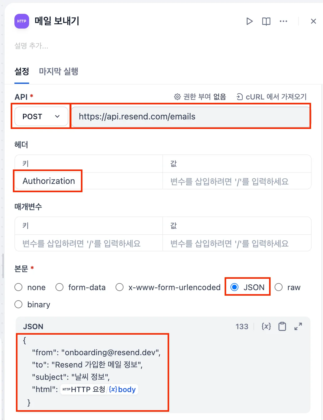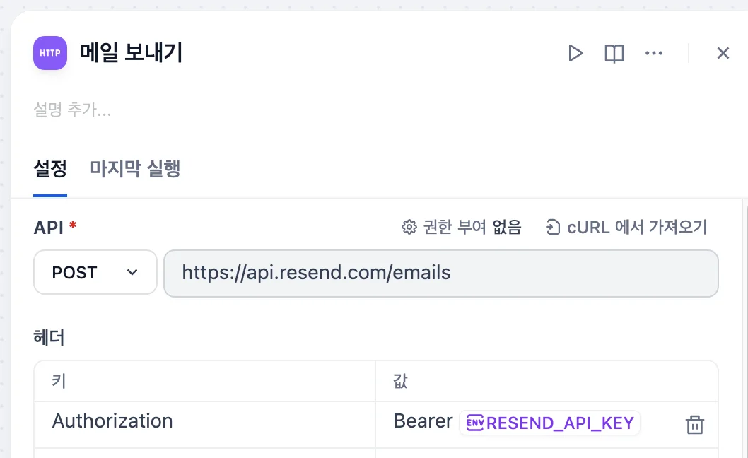 메일 보내기 노드의 헤더에 키: Authorization, 값: Bearer RESEND_API_KEY를 입력합니다. RESEND_API_KEY 앞에 Bearer 라는 텍스트를 적어주세요.