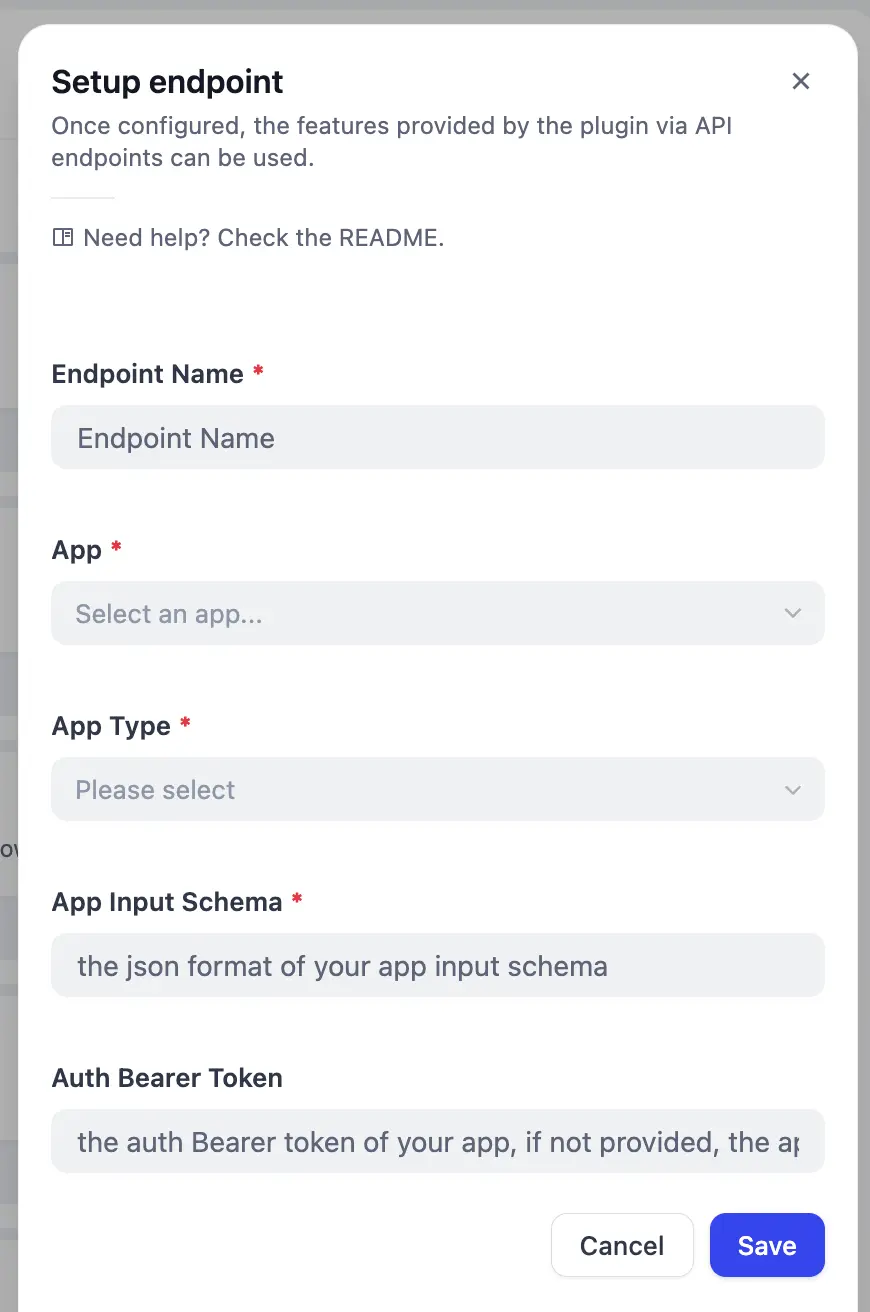 Endpoint Name은 원하는 대로 영어로 적어주세요. App은 MCP로 변환할 워크플로우를 선택하세요. 앱 타입은 채팅플로우=Chat, 워크플로우=Workflow입니다.