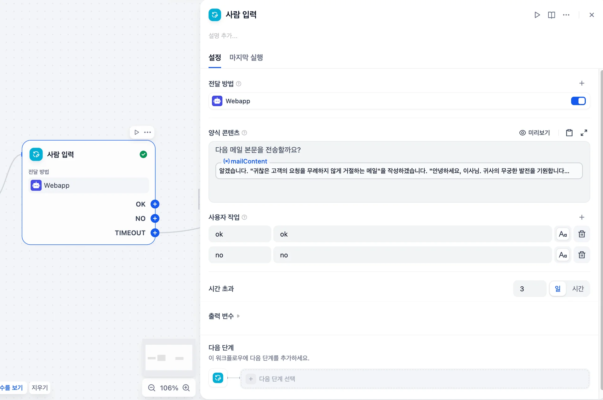 커스텀 액션 버튼: '승인', '반려', '에스컬레이션' 등 버튼 레이블을 직접 설정하고, 버튼 선택 결과에 따라 이후 경로가 자동으로 분기됩니다.