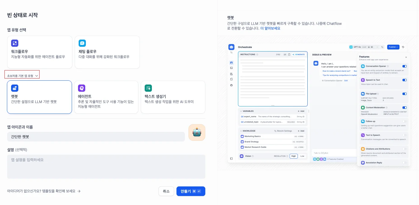 저희는 아직 초보자이기 때문에 초보자용 기본 앱 유형에서 챗봇을 선택하겠습니다.