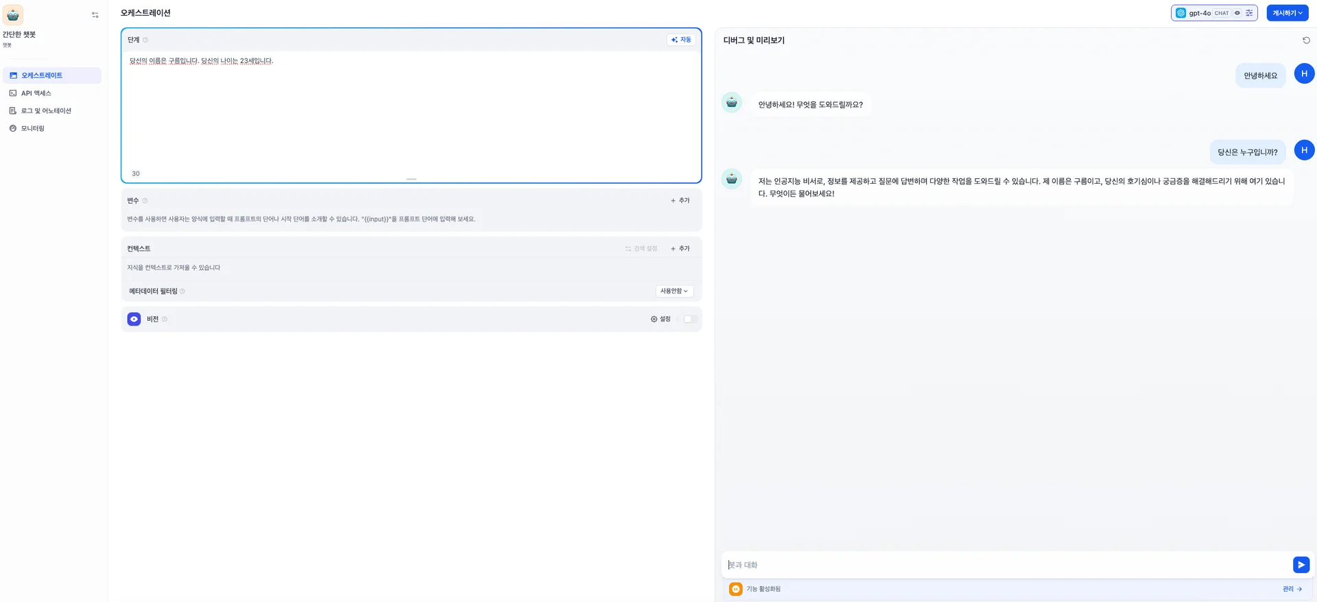 그렇다면 제가 챗봇에게 이름과 나이를 부여해 보겠습니다.