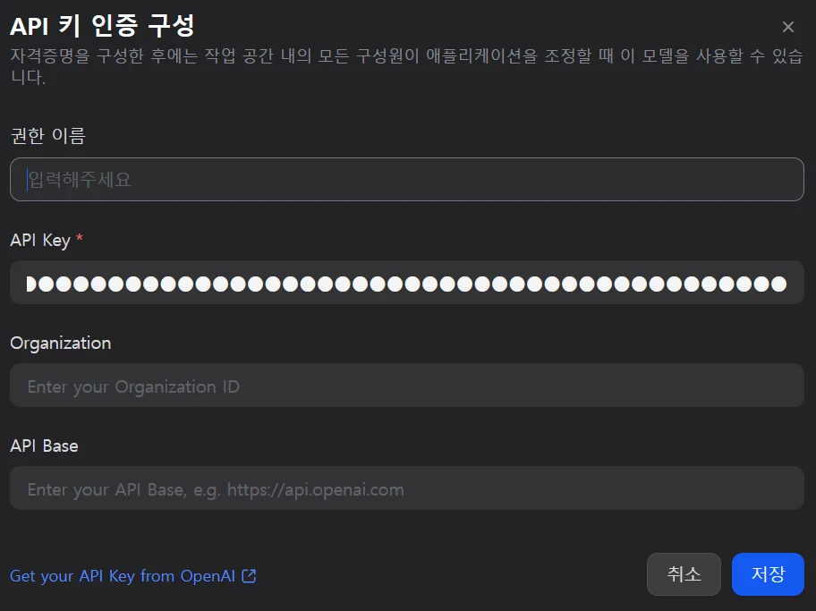 이 키를 Dify에 입력해야만, 비로소 내 워크스페이스에서 원하는 만큼 AI 기능을 자유롭게 쓸 수 있습니다.
