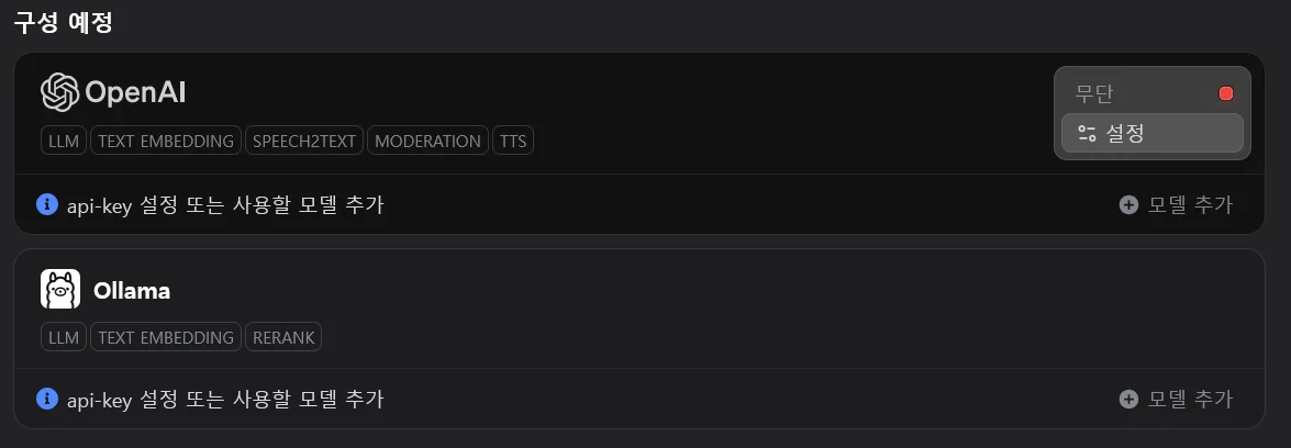쉽게 말해, Dify라는 ‘빈 로봇’에 ChatGPT처럼 실제로 움직이는 ‘AI 두뇌’를 연결하는 작업이라고 생각하시면 됩니다.