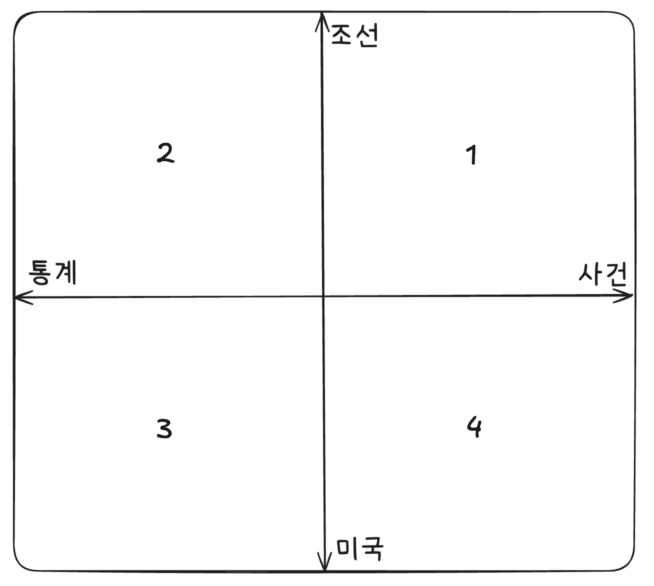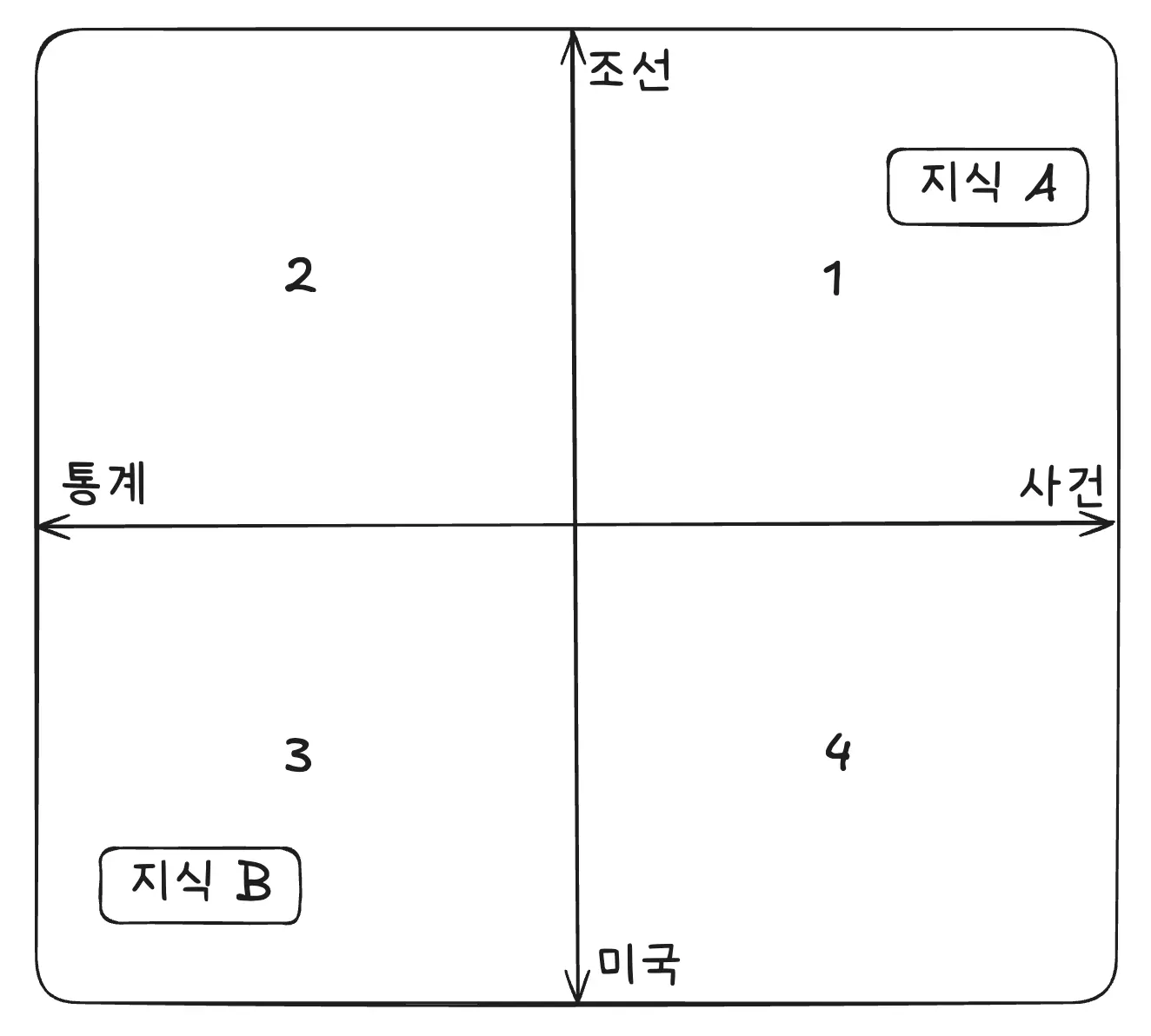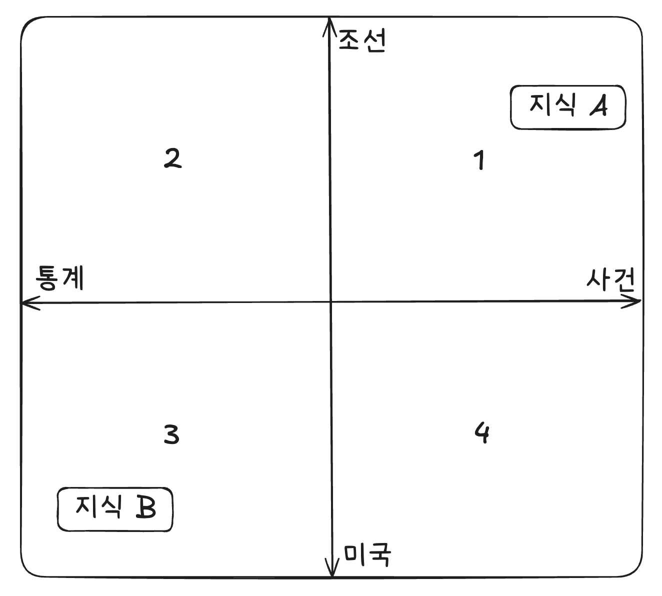 지식 A는 “조선”, “사건”과 관련이 있으므로 1사분면에, 지식 B는 “미국”, “통계”와 관련이 있으므로 3사분면에 들어갔습니다. 이제 두 지식에 대해 묻는 질문이 들어오면, 관련 지식을 찾을 수 있겠죠.