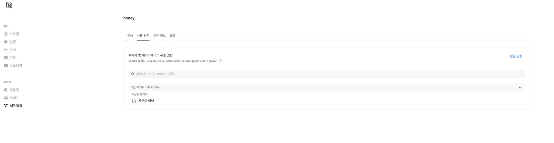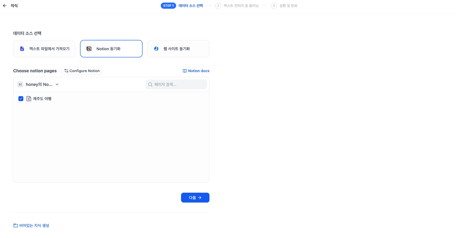 Notion 동기화 버튼을 클릭해 방금 등록한 API를 통해 접근 가능한 Notion 페이지 목록에서 ‘제주도 여행’ 문서를 선택합니다.