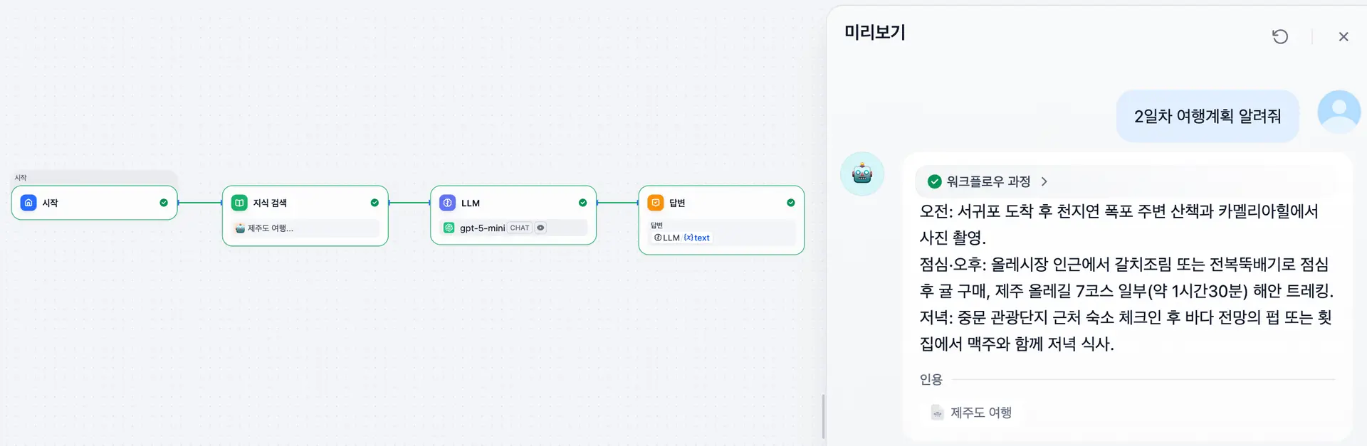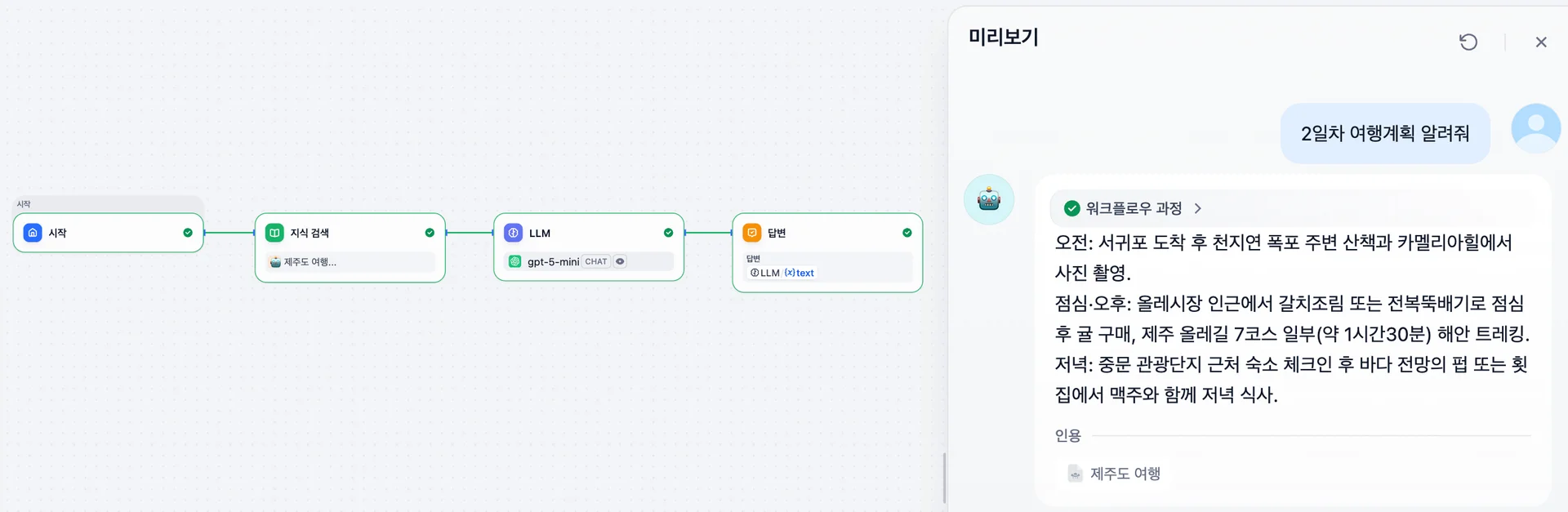 채팅플로우를 생성하고 시작노드에 방금 등록한 ‘제주도 여행’ 지식을 연결합니다.