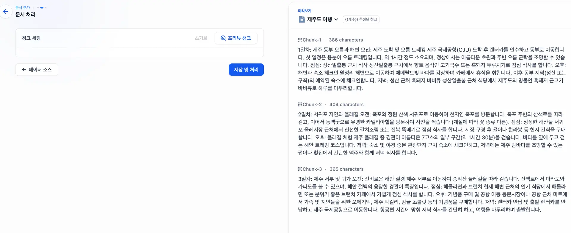 근로기준법 RAG를 만들었던 과정과 동일하게, 이 ‘제주도 여행’ 문서도 청크를 설정하고 벡터 DB에 임베딩하는 과정을 거칩니다.