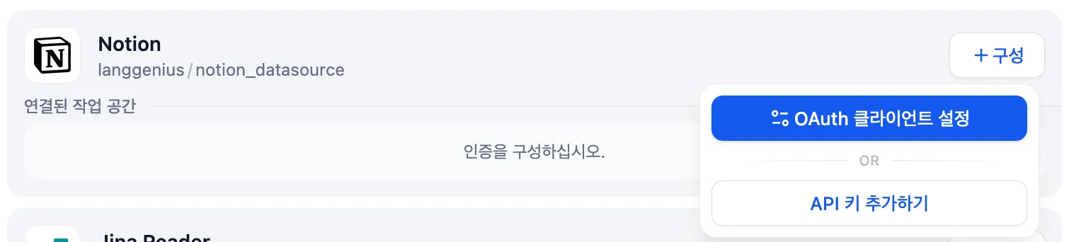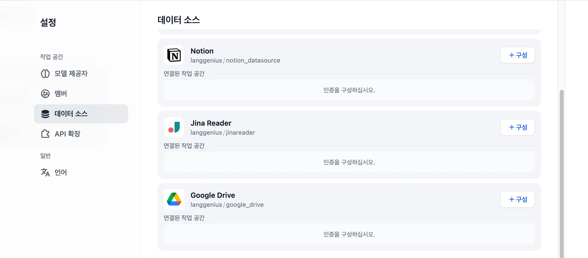 설정의 데이터 소스 탭에서 Notion과 Google Drive 등을 통해 문서를 가져올 수 있도록 사전 구성을 진행해야 합니다.
