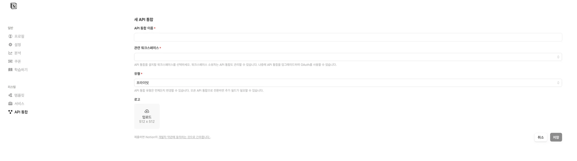 Notion의 API 설정 페이지로 이동하여 새로운 통합을 만듭니다.