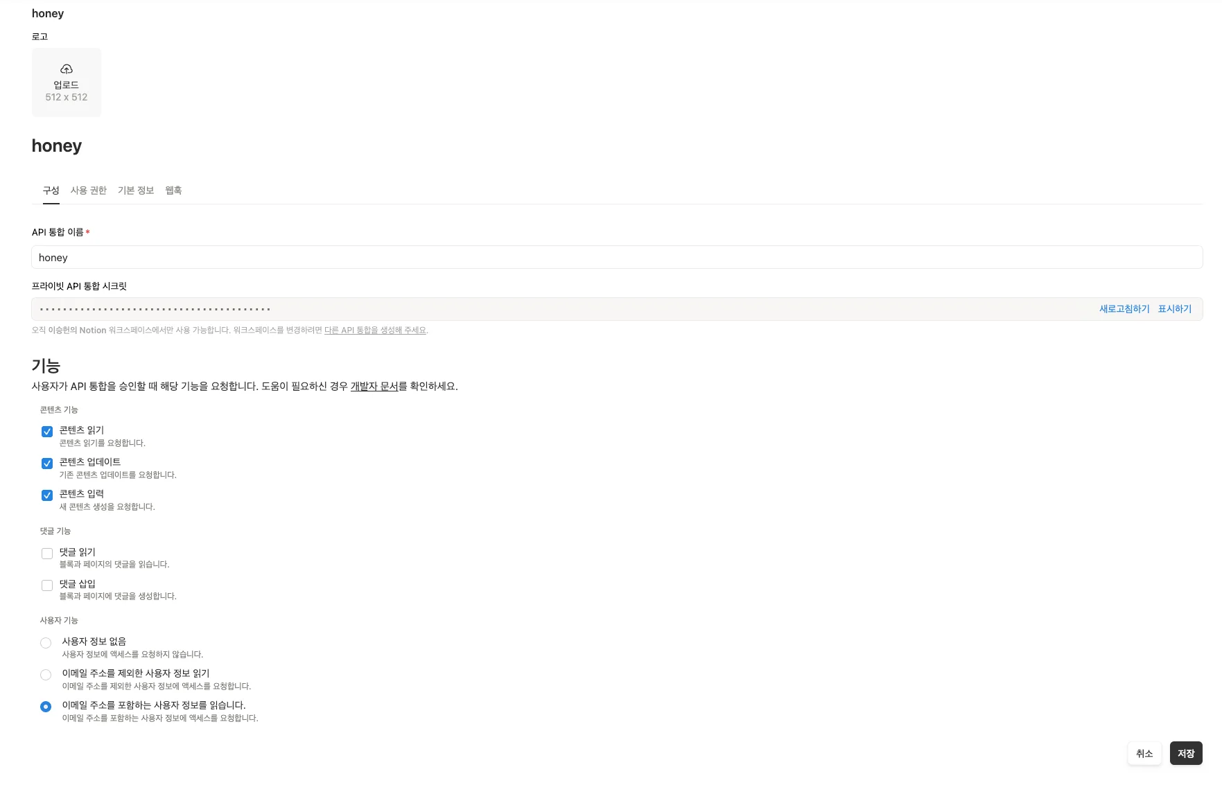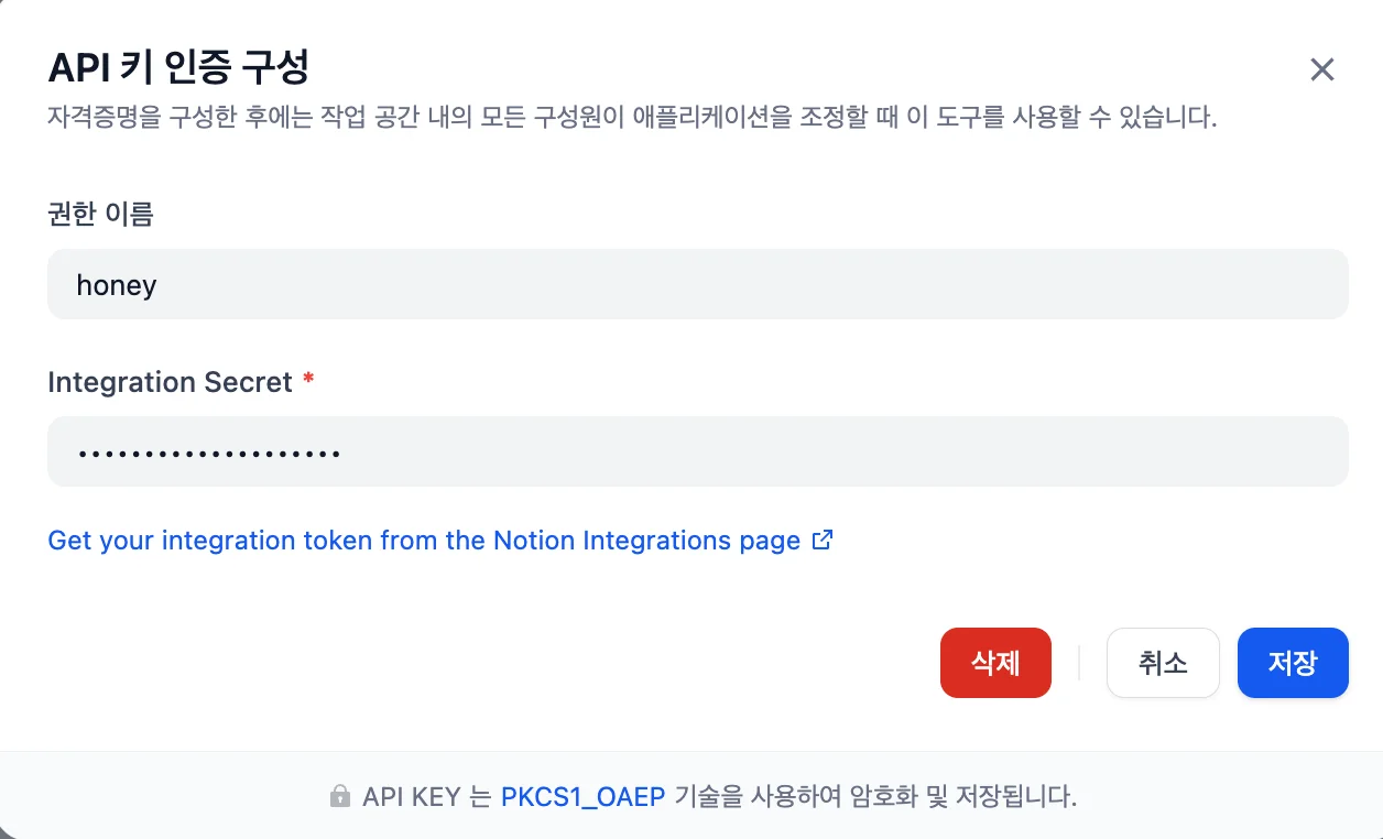 Notion에서 발급받은 API 통합 이름과 통합 비밀 키를 등록합니다.