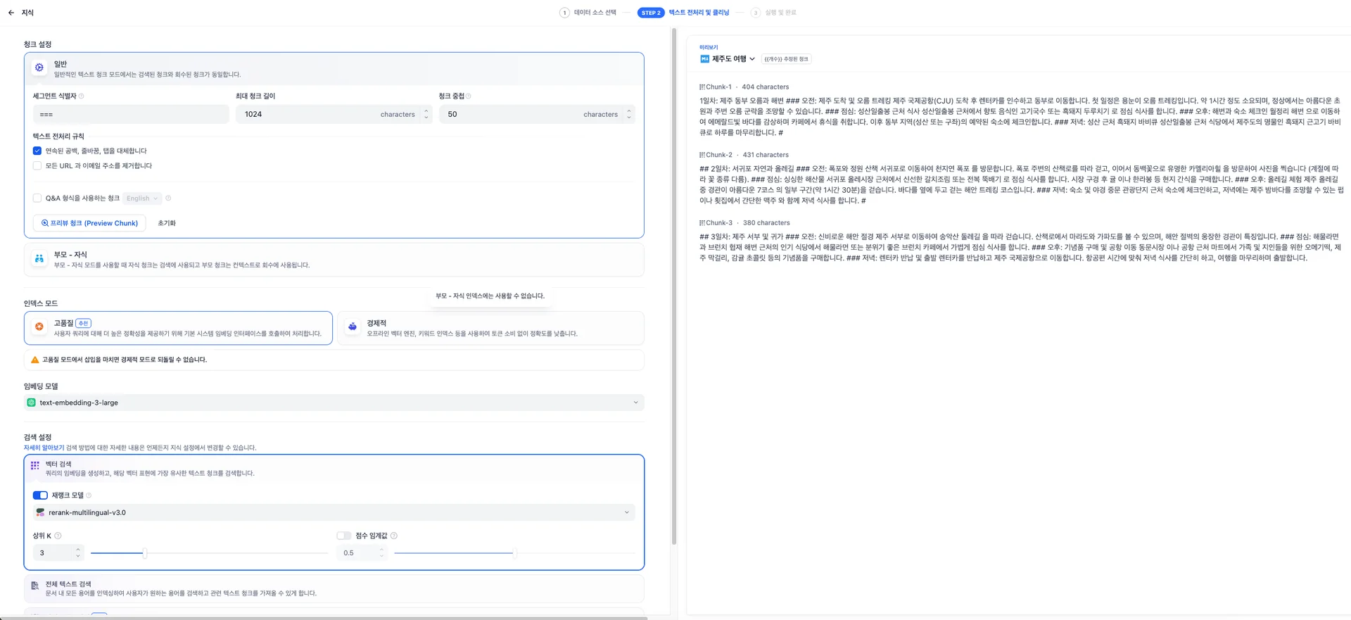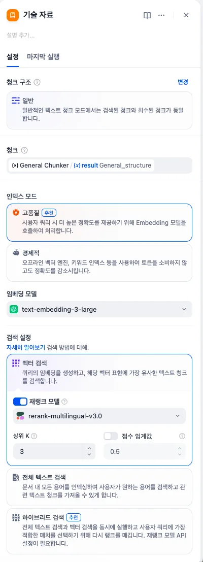 마지막 기술 자료 노드에서 청크 구조, 인덱스 모드, 임베딩 모델, 검색 설정, 재랭크 모델을 설정하면 지식 파이프라인 구성이 완료됩니다.