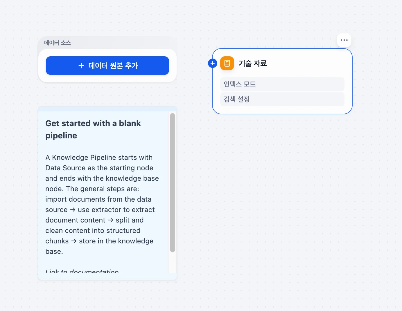 ‘빈 지식 파이프라인’을 클릭하면 데이터 소스 노드와 기술 자료 노드가 기본으로 생성됩니다.