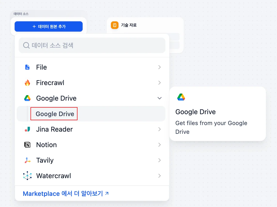 데이터 원본 추가에서 Google Drive를 선택하여 문서를 가져올 Google Drive 노드를 연결합니다.