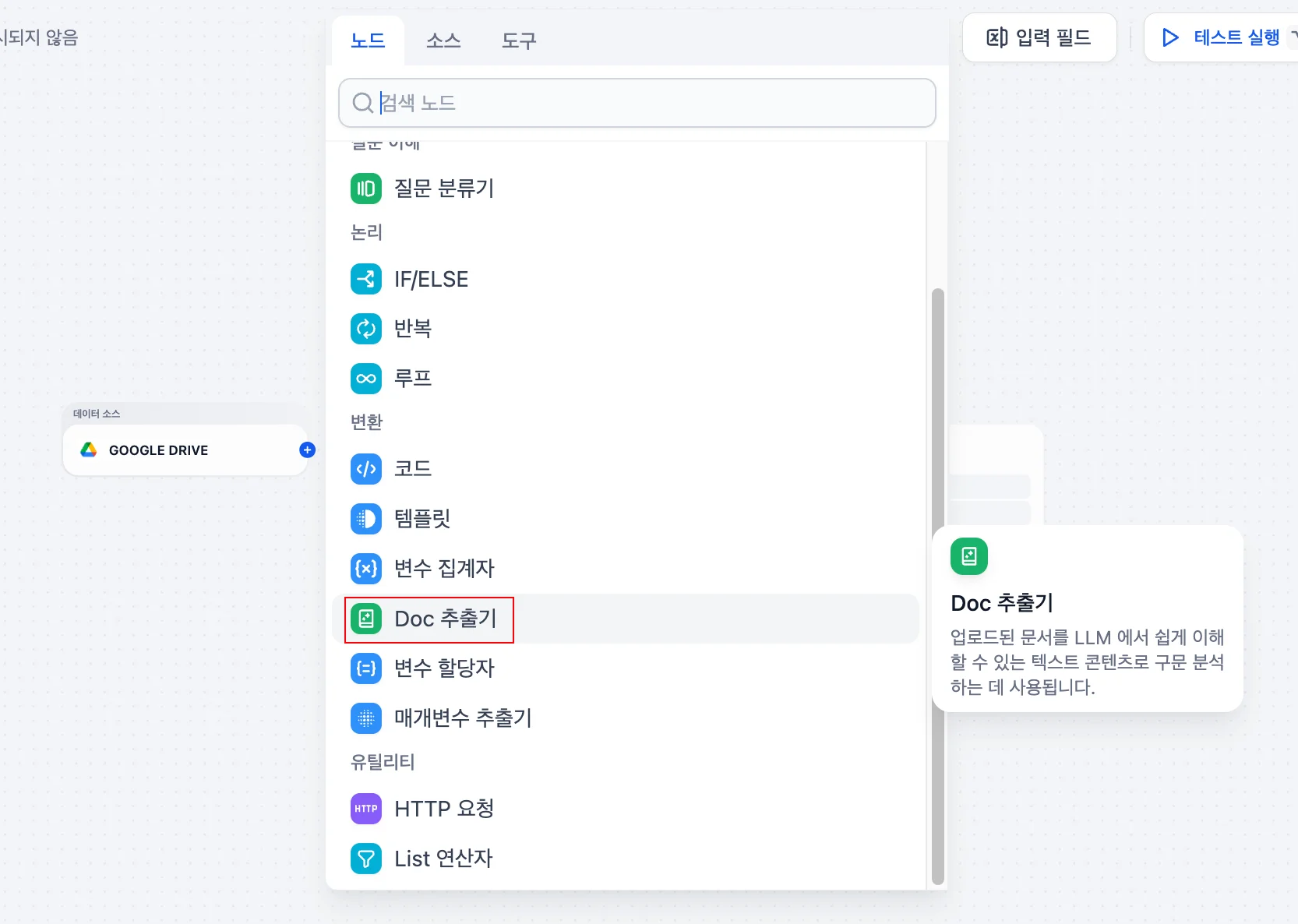 Google Drive 문서를 청크 설정 전에 텍스트로 추출해야 하므로, 다음으로 Doc 추출기 노드를 연결합니다.