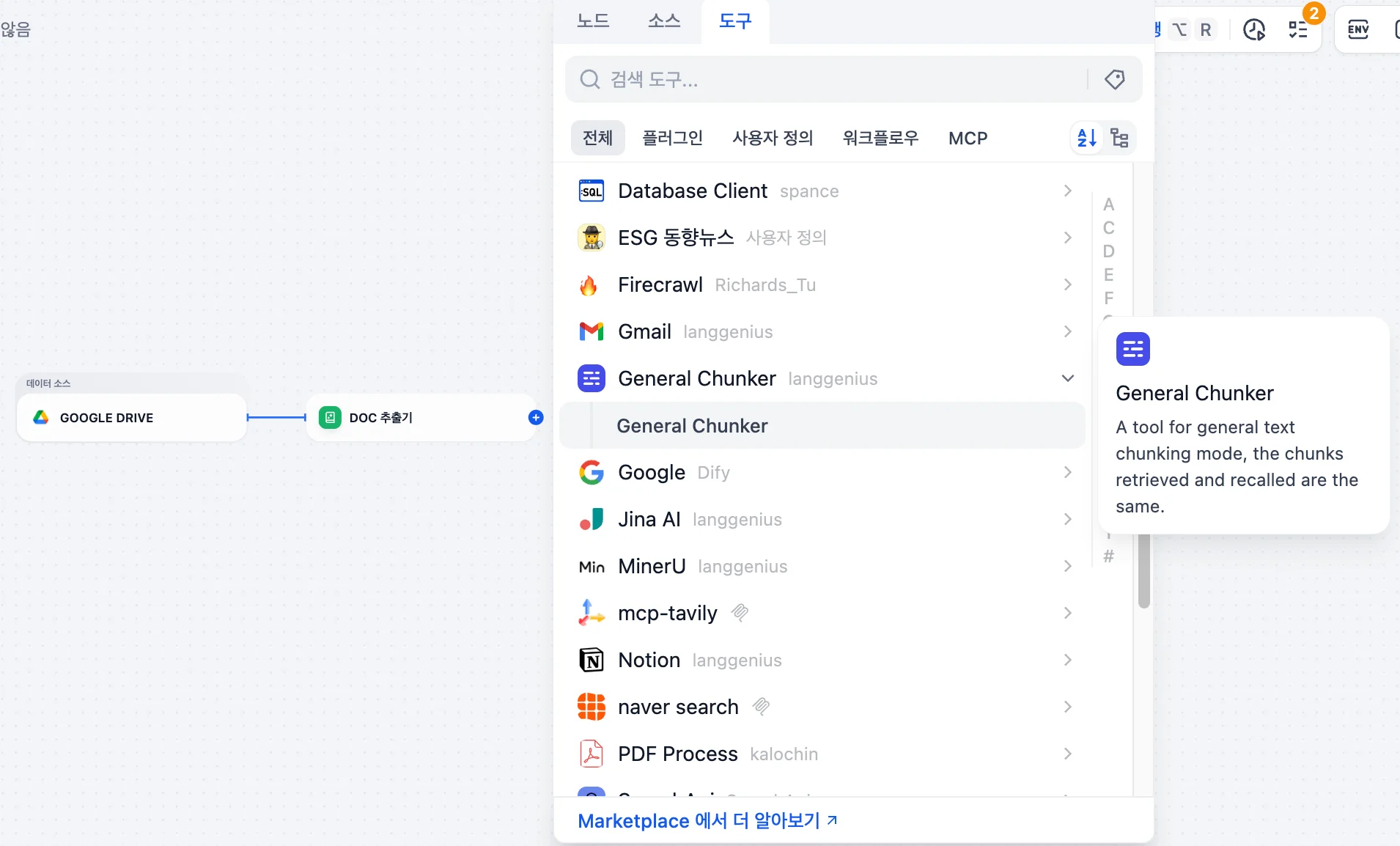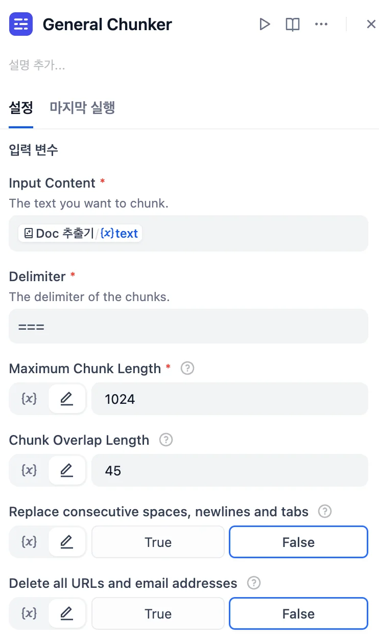 추출된 문서의 청크를 설정하고 벡터DB에 임베딩시키기 위해 General Chunker 도구를 연결합니다.