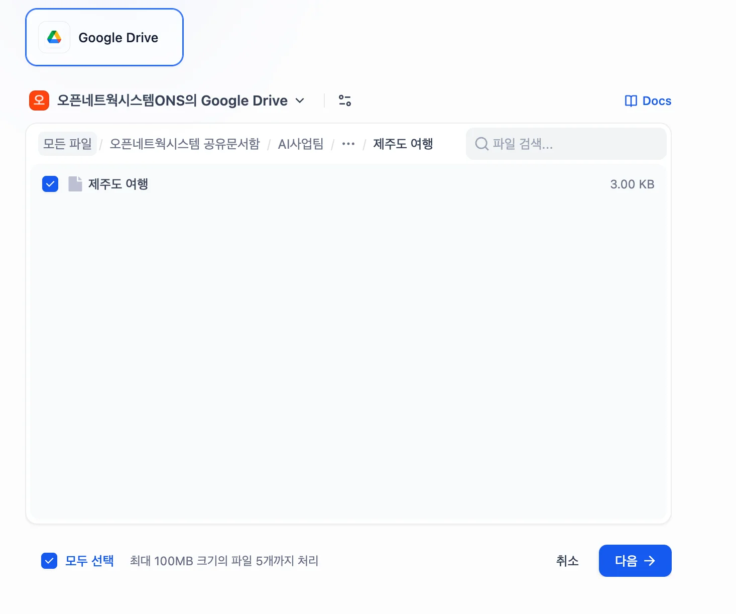 파이프라인이 완성되면, 파일 추가 버튼을 눌러 Google Drive 폴더에 있는 ‘제주도 여행’ 문서를 선택합니다.