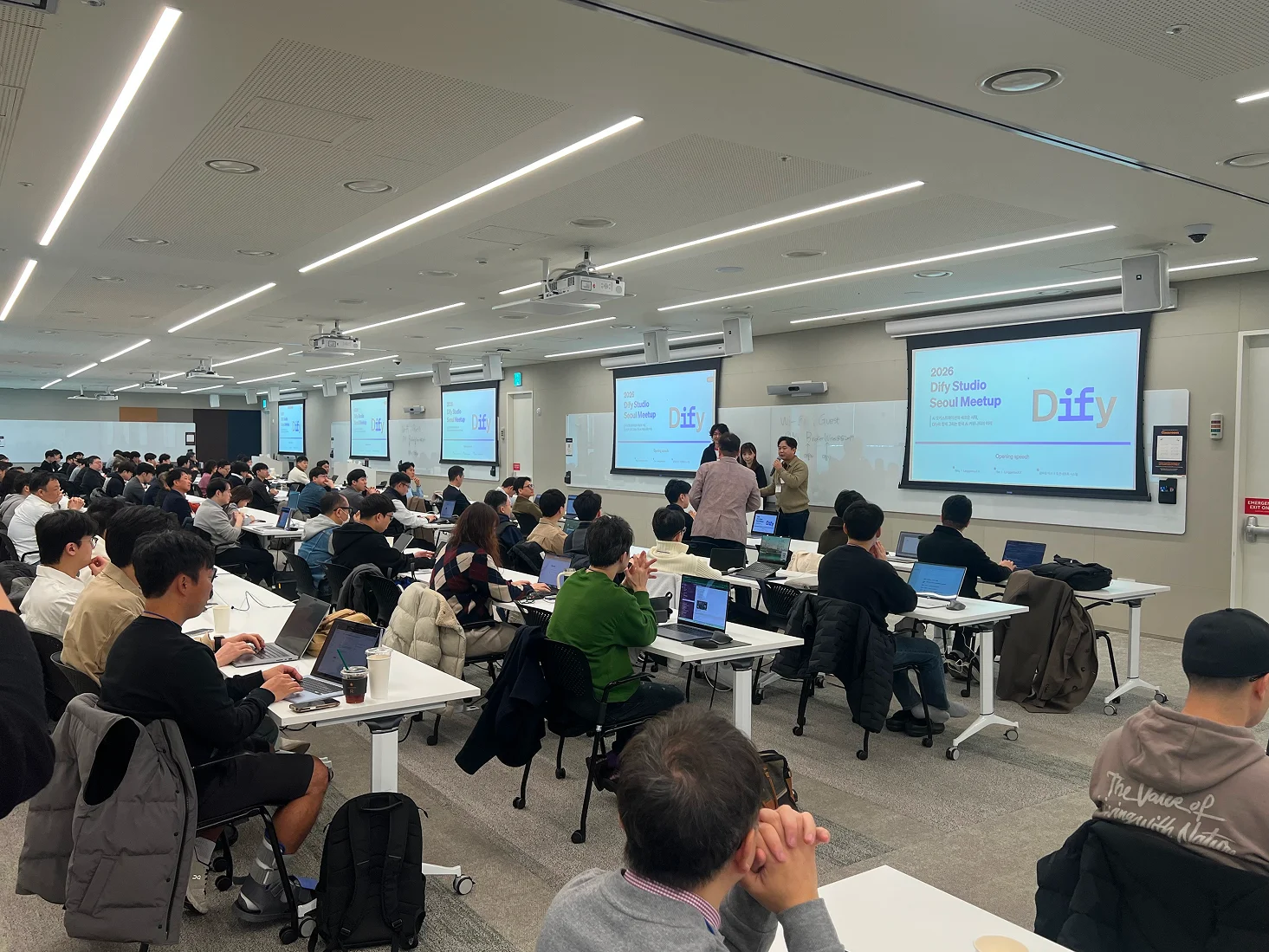 국내에서는 최초인 ‘Dify meetup’ 행사를 위해 일본 지사 Langgenius K.K. 가 참석했고 약 120명의 국내 기업 관계자들이 참가 신청을 통해 행사장을 가득 채웠는데요. 발표 장소인 교육장 전체를 확장해야 했을 정도로 큰 규모와 그만큼 다양하고 유익한 인사이트 교류가 이루어졌습니다.