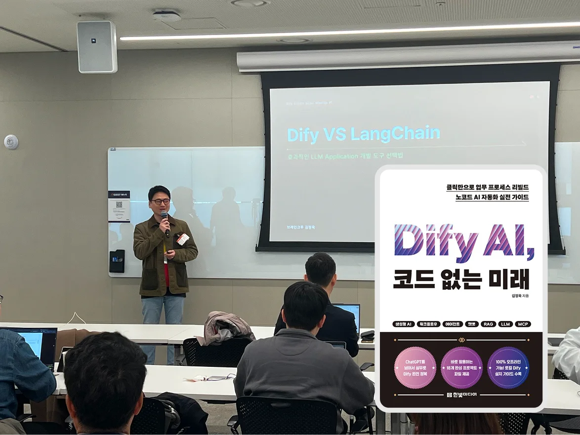 그 중에 ‘Dify AI 코드 없는 미래’의 저자이며 브레인크루의 김정욱님은 기업 관계자들이 자주하는 질문 중 하나인 Dify와 Langchain의 차이점, 실무에서 Dify의 사용법과 강점 등을 상세하게 다룬 내용으로 기업 실무자들의 궁금증을 해소해 주었습니다.