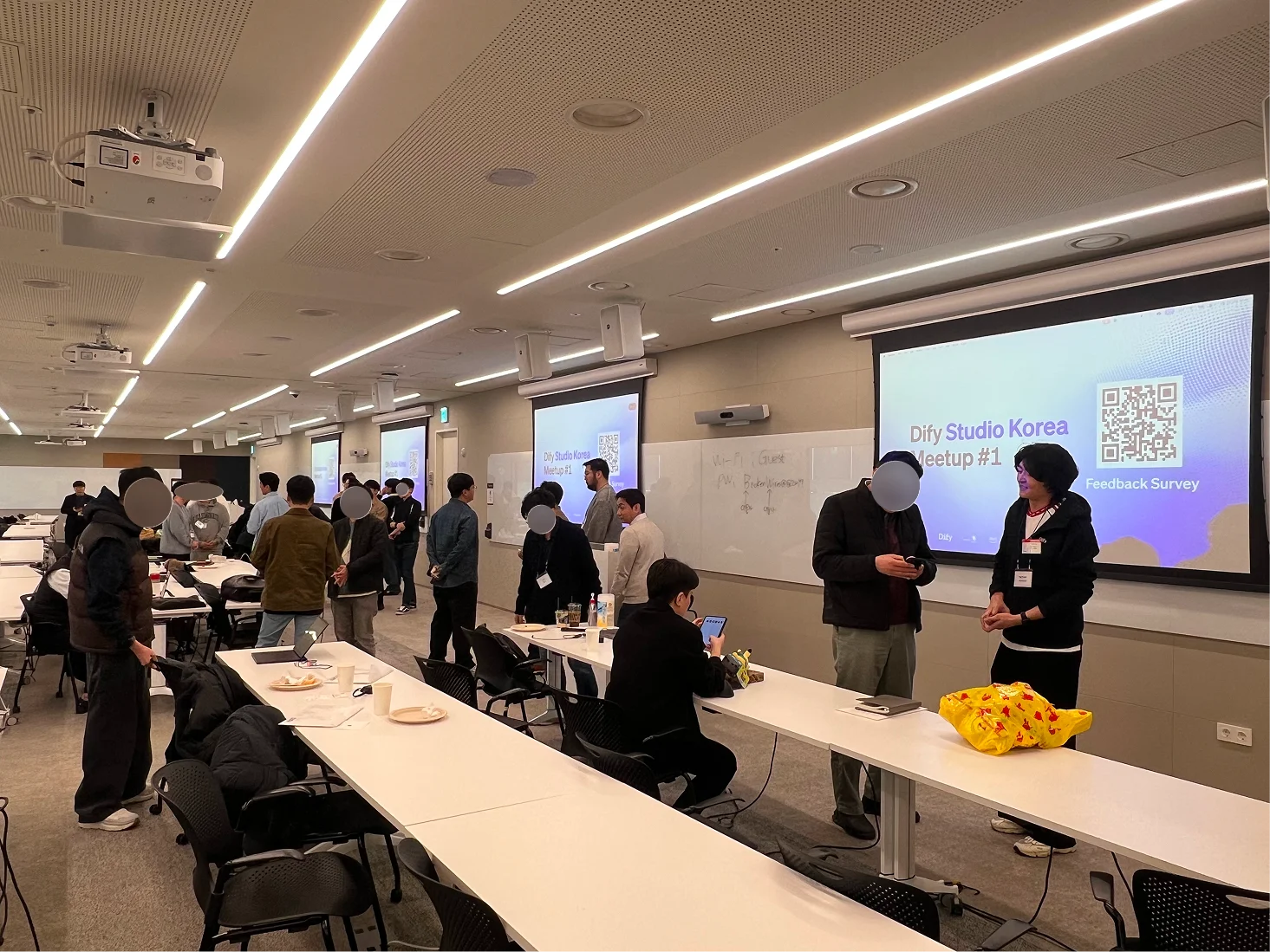 공식 일정이 모두 끝난 후에도 발표 세션 QnA 시간에 다 하지 못했던 질문과 이야기를 나누기 위해 많은 분들이 교육장에 남았습니다. 이 순간이 커뮤니티 행사의 열기를 가장 잘 보여주었습니다. 일방적인 정보를 전달 받으러 온 자리가 아닌, 같은 고민을 가진 Dify 의 ‘팬덤’들이 같은 주제로 이야기를 나누는 자리였다는 것.