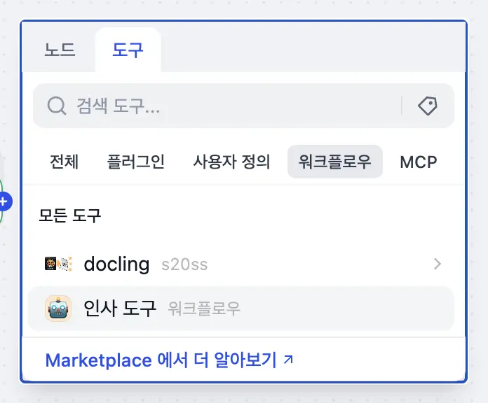 이제 다른 워크플로우에서 사용할 수 있습니다. 노드 생성 UI에서 “워크플로우”를 선택하면 됩니다.