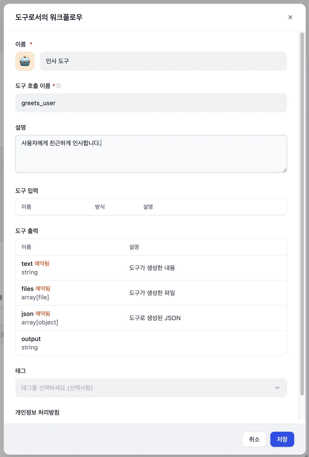 “도구 호출 이름”과 “설명”은 AI Agent가 참고하는 내용이므로 상세히 적어주면 좋습니다.