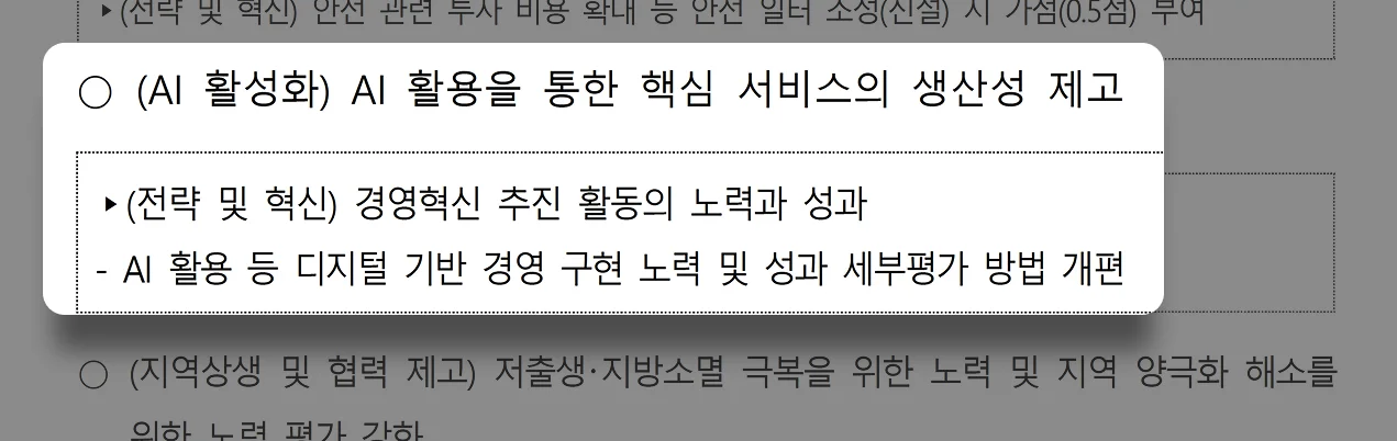 이번 평가의 가장 큰 특징은 '공공성과 효율성의 균형'이며, 그 핵심 도구로 AI(인공지능) 활성화를 정면으로 내세우고 있습니다.