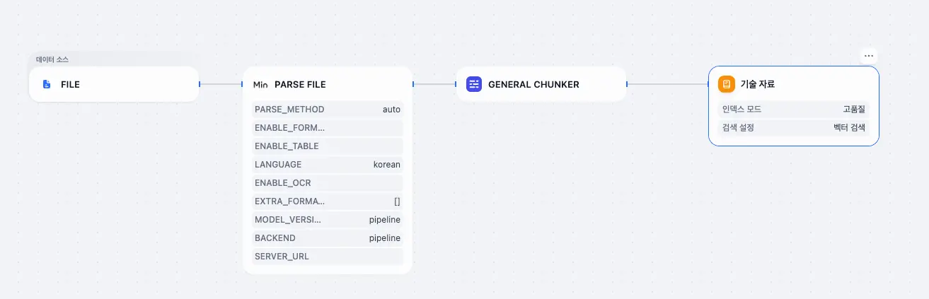 이전 실습에서 Google Drive를 지식 파이프라인을 통해 등록한 것처럼 General Chunker 노드를 통해 청크를 설정하고 기술 자료에서 인덱스 모드, 임베딩 모델, 검색 설정 등을 완료합니다.