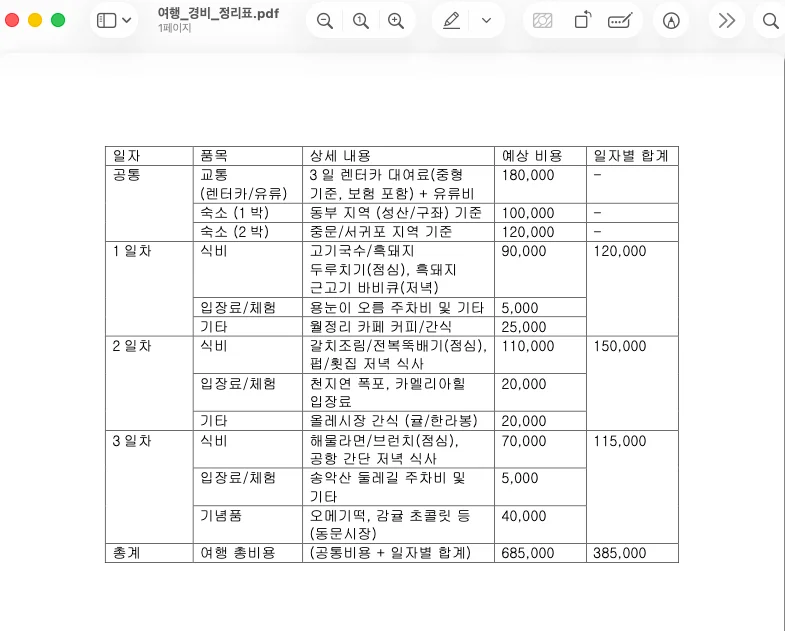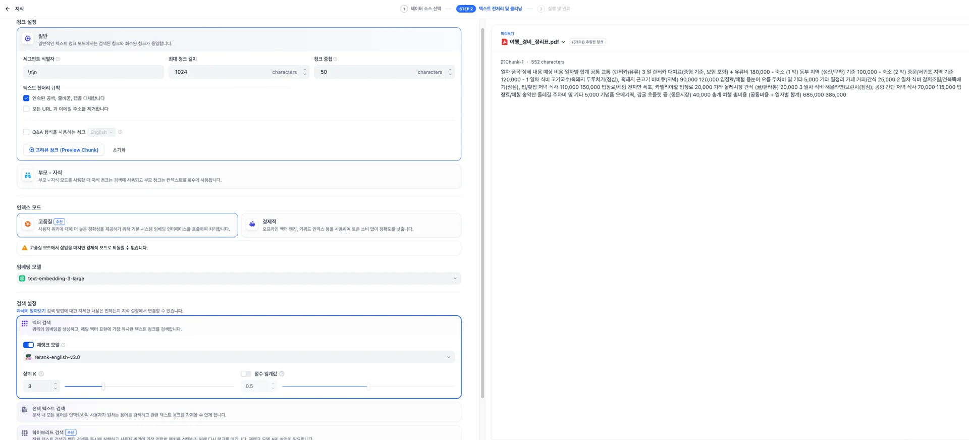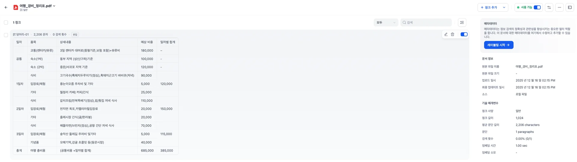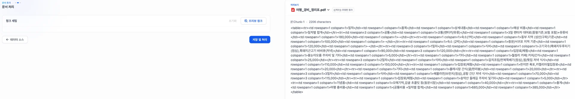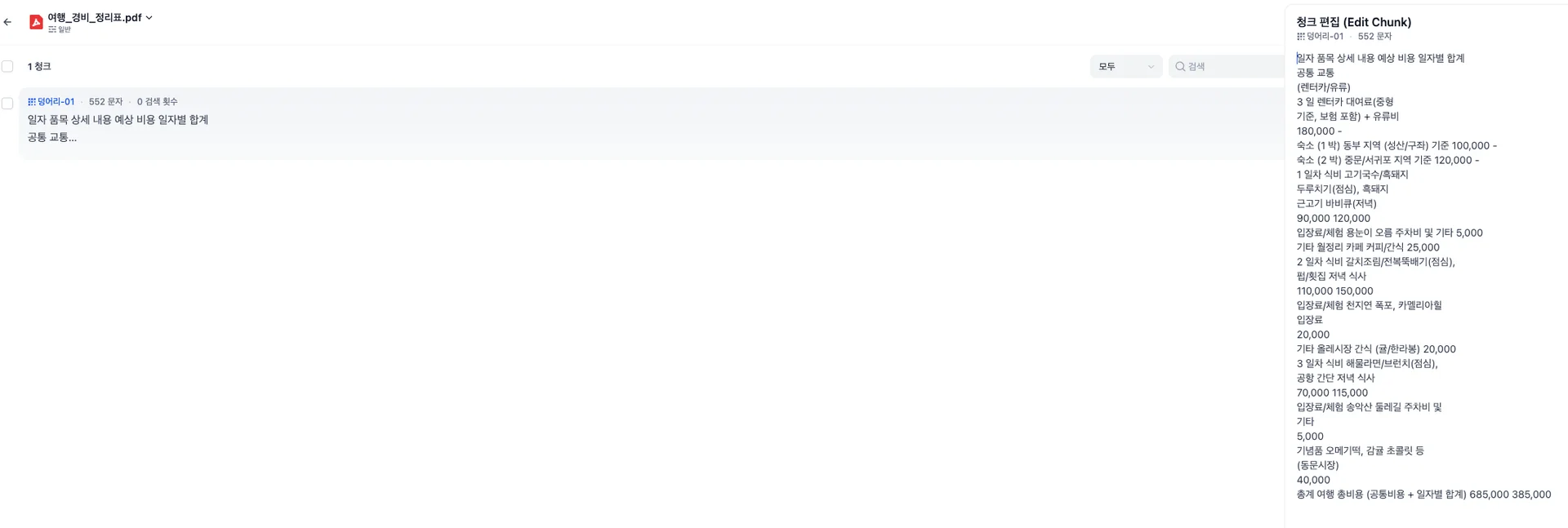 여행 경비표 PDF 파일을 업로드한 후 프리뷰 청크를 확인해 봅니다.