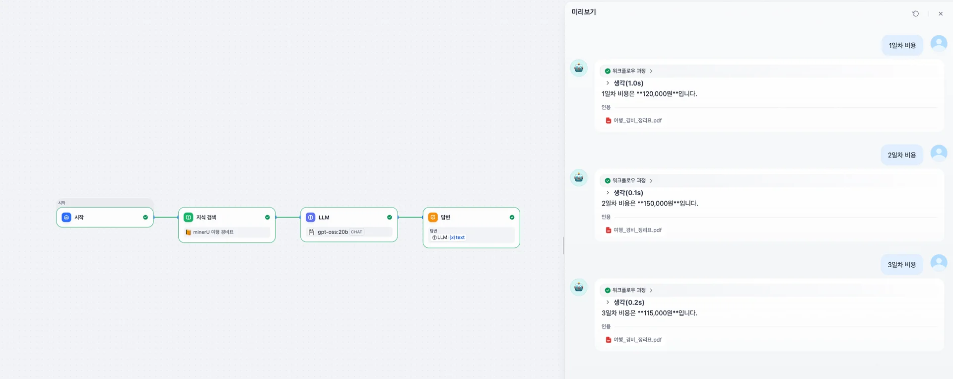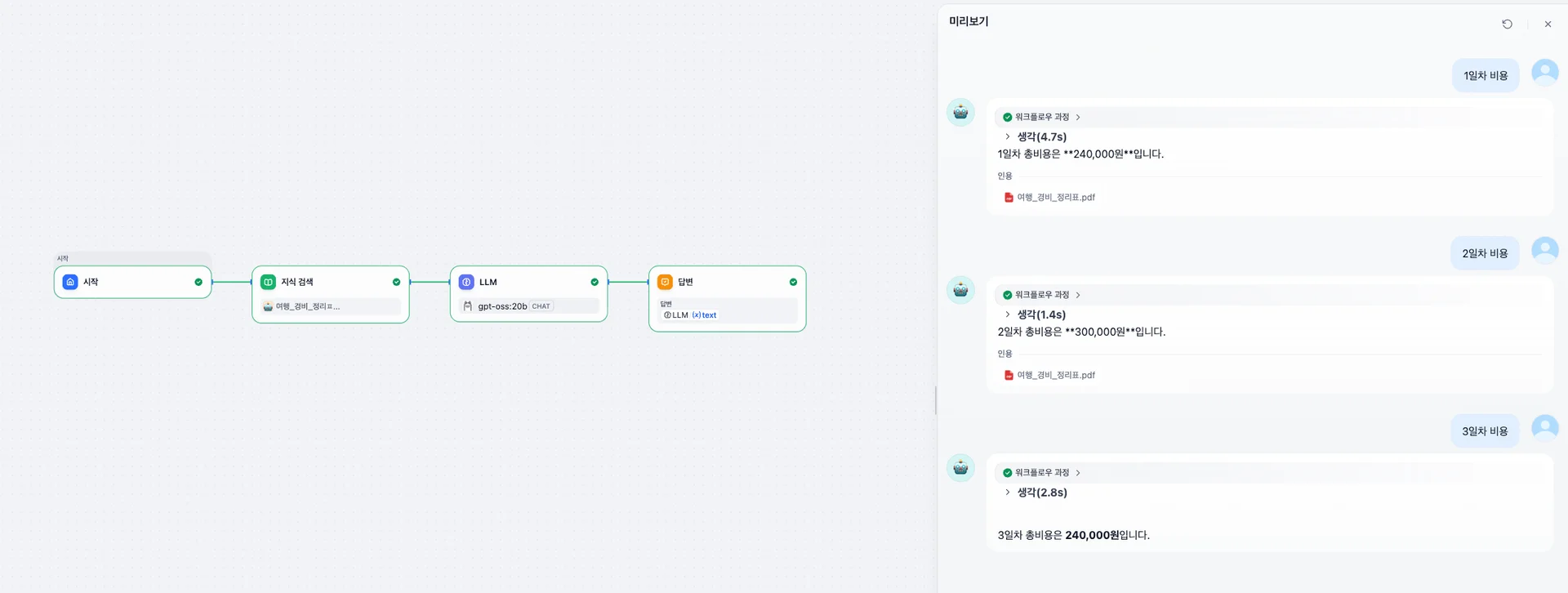 이번에는 LLM이 1일 차, 2일 차, 3일 차 비용을 모두 정확하게 답변했으며, 답변 속도 또한 훨씬 빨라지는 효과를 얻을 수 있었습니다.