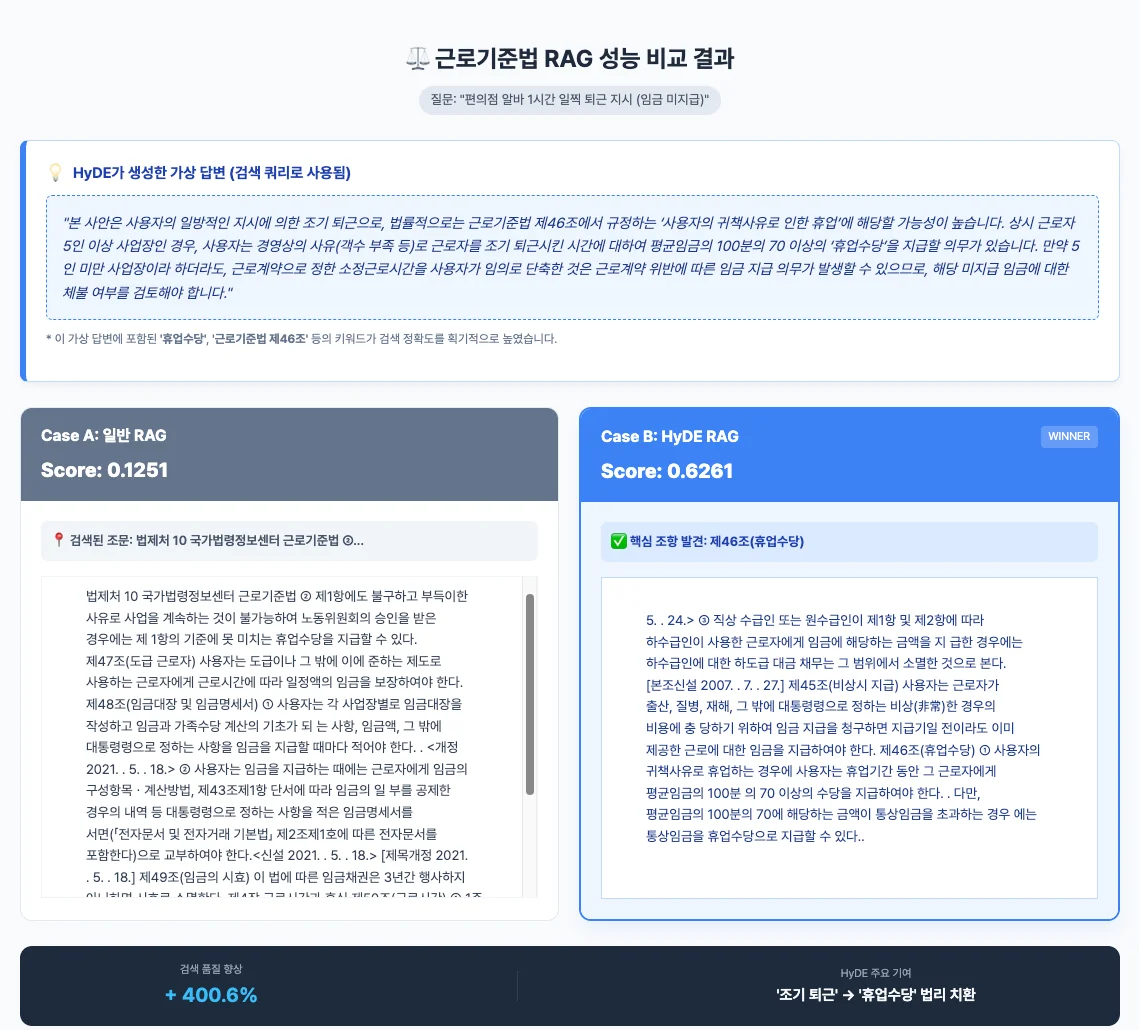일반 RAG는 ‘알바’, ‘사장님’ 같은 단어를 법전에서 찾으려다 보니 실패합니다. 반면 HyDE는 LLM이 이를 ‘근로자’, ‘휴업 수당’ 이라는 법률 용어로 먼저 치환(가상 답변 생성) 한 뒤 검색하기 때문에 정확도가 압도적입니다.